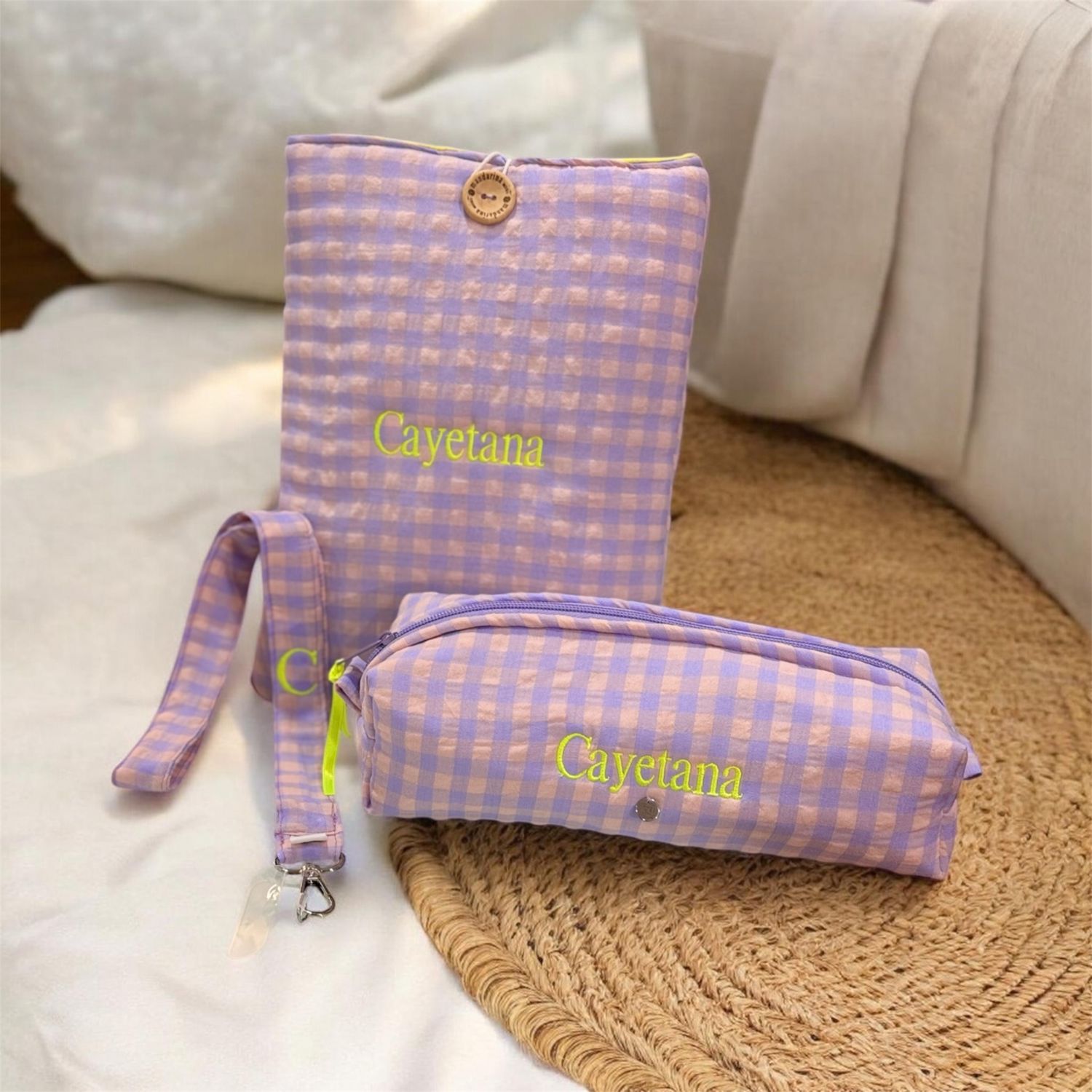 Packs bolso Vichy rosa blush personalizado + Coletero+ Lanyard.